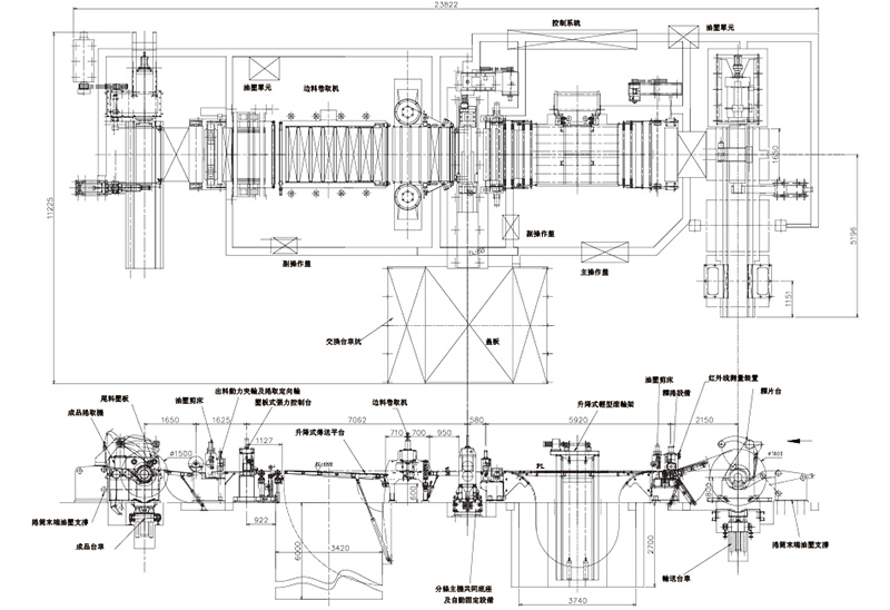 2.分條機主要構(gòu)造:備料臺/上料臺車/開卷機/釋卷設(shè)備/前活套/基準(zhǔn)邊側(cè)導(dǎo)輪組/押送對輪/分條主機/邊料卷取機/后活套/卷帶分隔設(shè)備/張力控制臺/卷取定向輪及出料動力夾輪/成品卷取機(無縫式卷筒)/油壓剪床二臺(一臺用于切頭另一臺用于分切)/成品臺車/卷筒末端油壓支撐二臺.